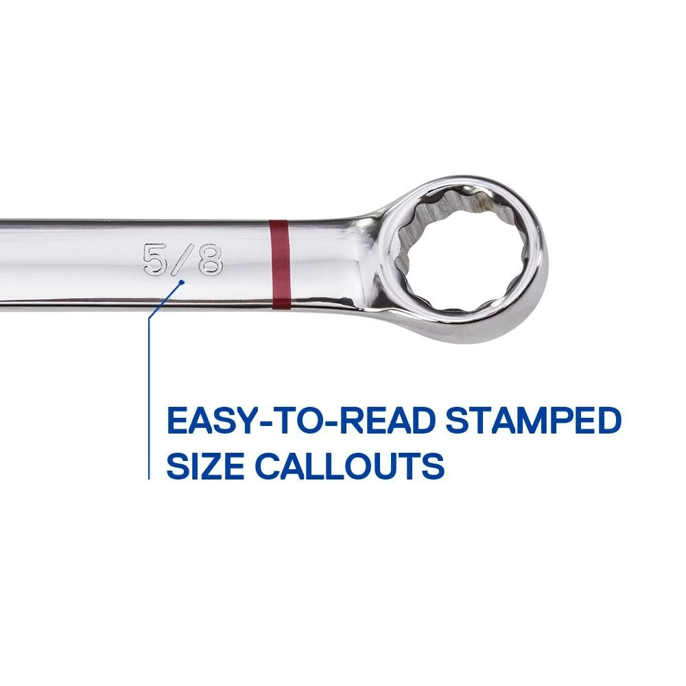 - Wrenches are marked with a hard-stamped size callout and a red color stripe to help quickly identify SAE wrenches